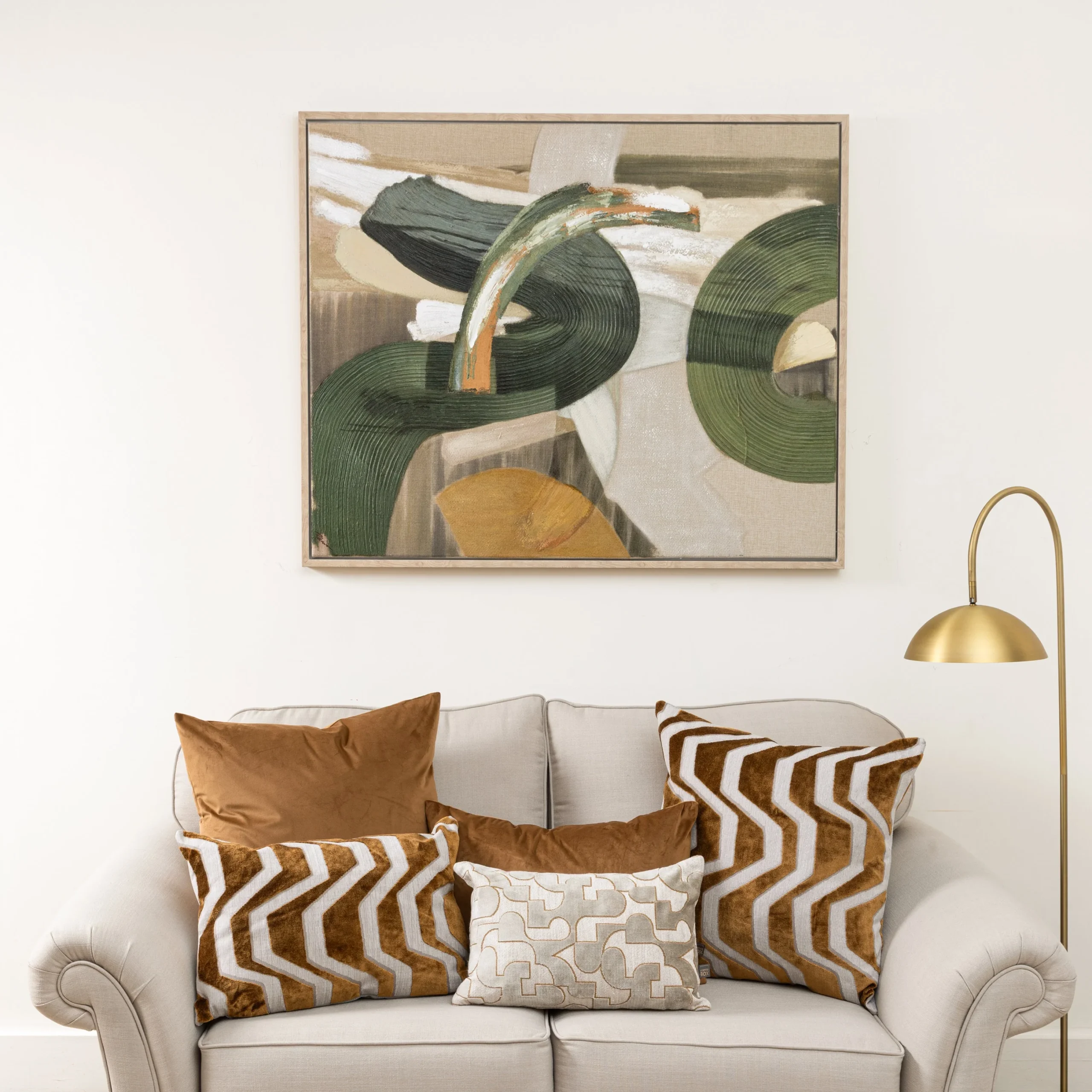 Add bold sophistication to your interior with Cody Green, a hand-painted abstract wall art piece designed to command attention. Painted on a high-quality linen blend canvas, Colby features overlapping geometric shapes in earthy green, ochre, and cream tones. The raised texture and sweeping brushwork create depth and energy, making it an ideal focal point for modern or mid-century inspired interiors. The light wood floating frame complements its organic palette, and with two-way hanging capability, you can style it either vertically or horizontally to suit your space.