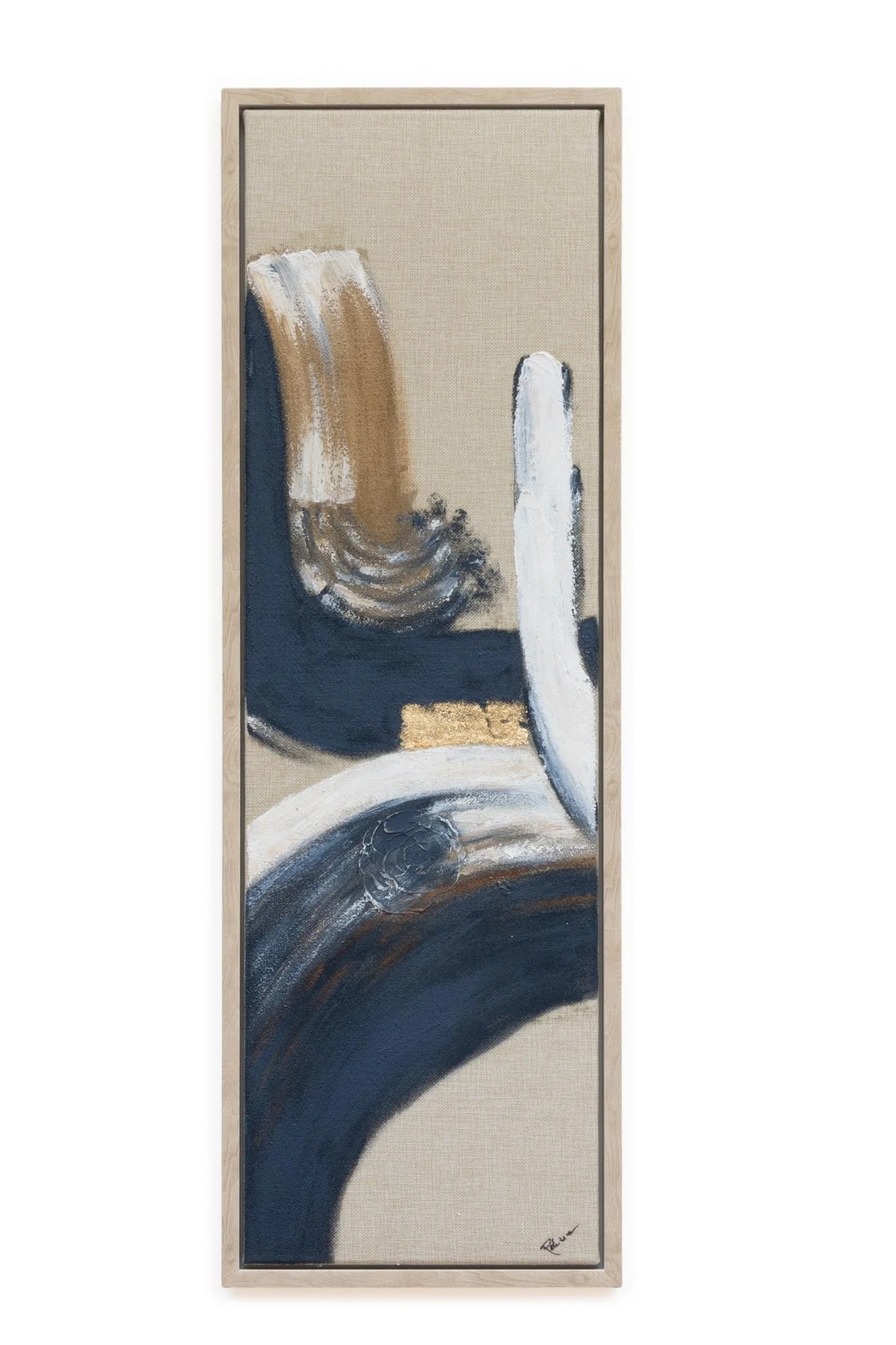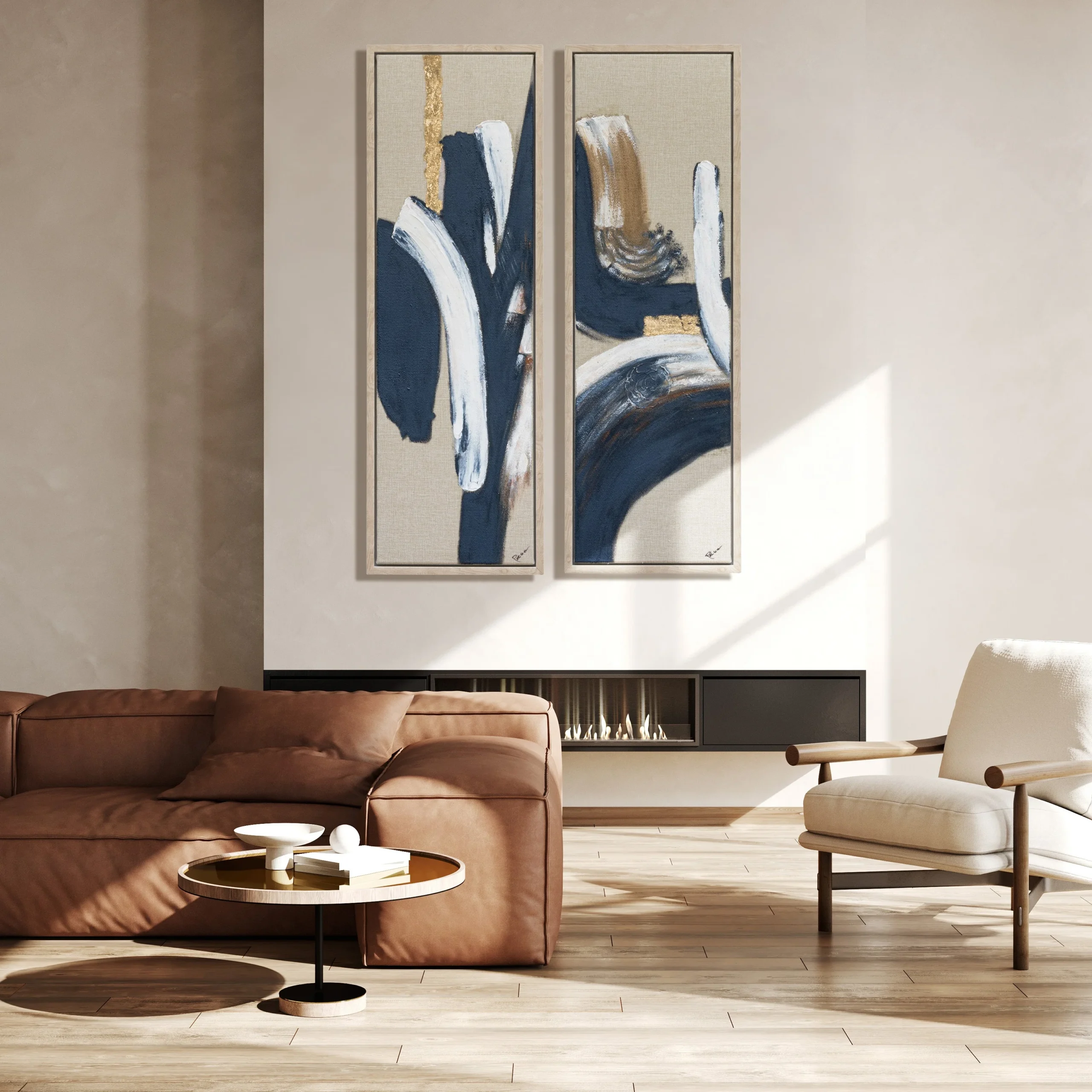 Make a powerful visual statement with this contemporary abstract diptych, expertly crafted on high-quality linen canvas. Featuring a bold composition of sweeping brushstrokes in matte navy, white, and taupe tones, this piece is elevated by the subtle shimmer of gold foil accents. The dual-panel design creates a sense of movement and balance, ideal for bringing symmetry and energy into your space. This versatile artwork can be styled vertically or horizontally thanks to its two-way hanging capability. Finished in a modern floating frame, this set is perfect for adding depth and contrast to neutral or minimalist interiors.