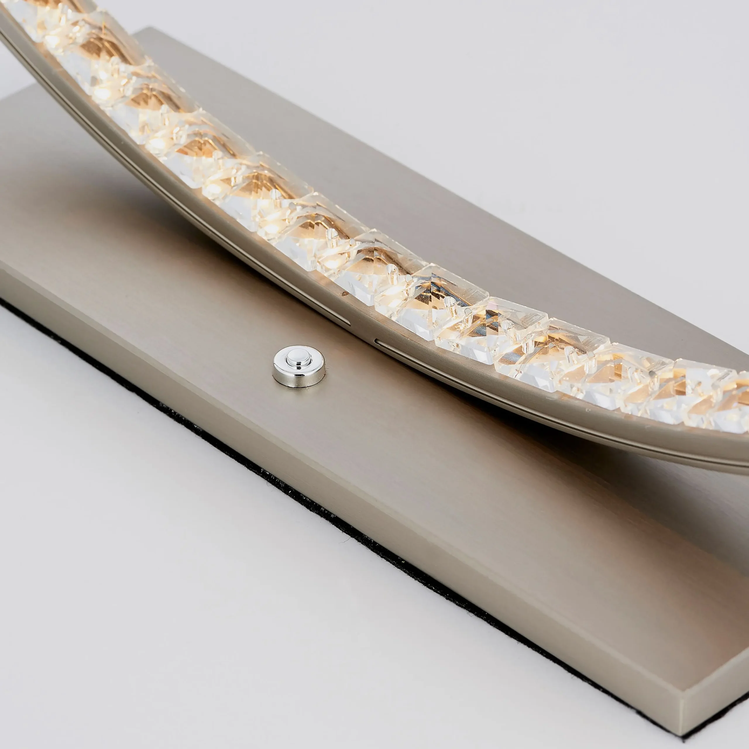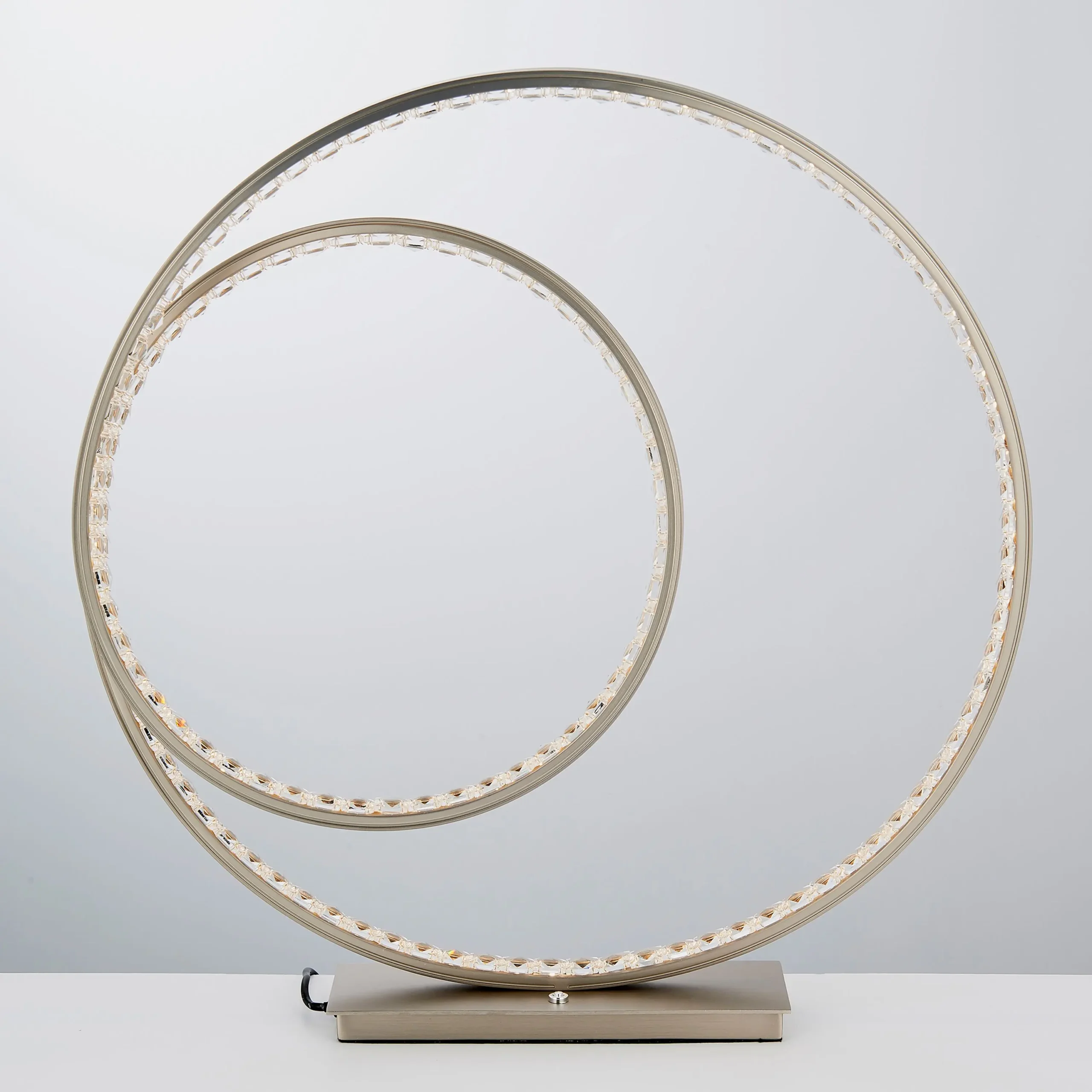 Contemporary LED TABLE LAMP with a striking continuous loop of LED lights diffused through K5 crystals. Perfect for modern interiors and plated in a sophisticated matt nickel finish. Select 3 different light levels by touching an simple integrated chrome plated switch located on the base