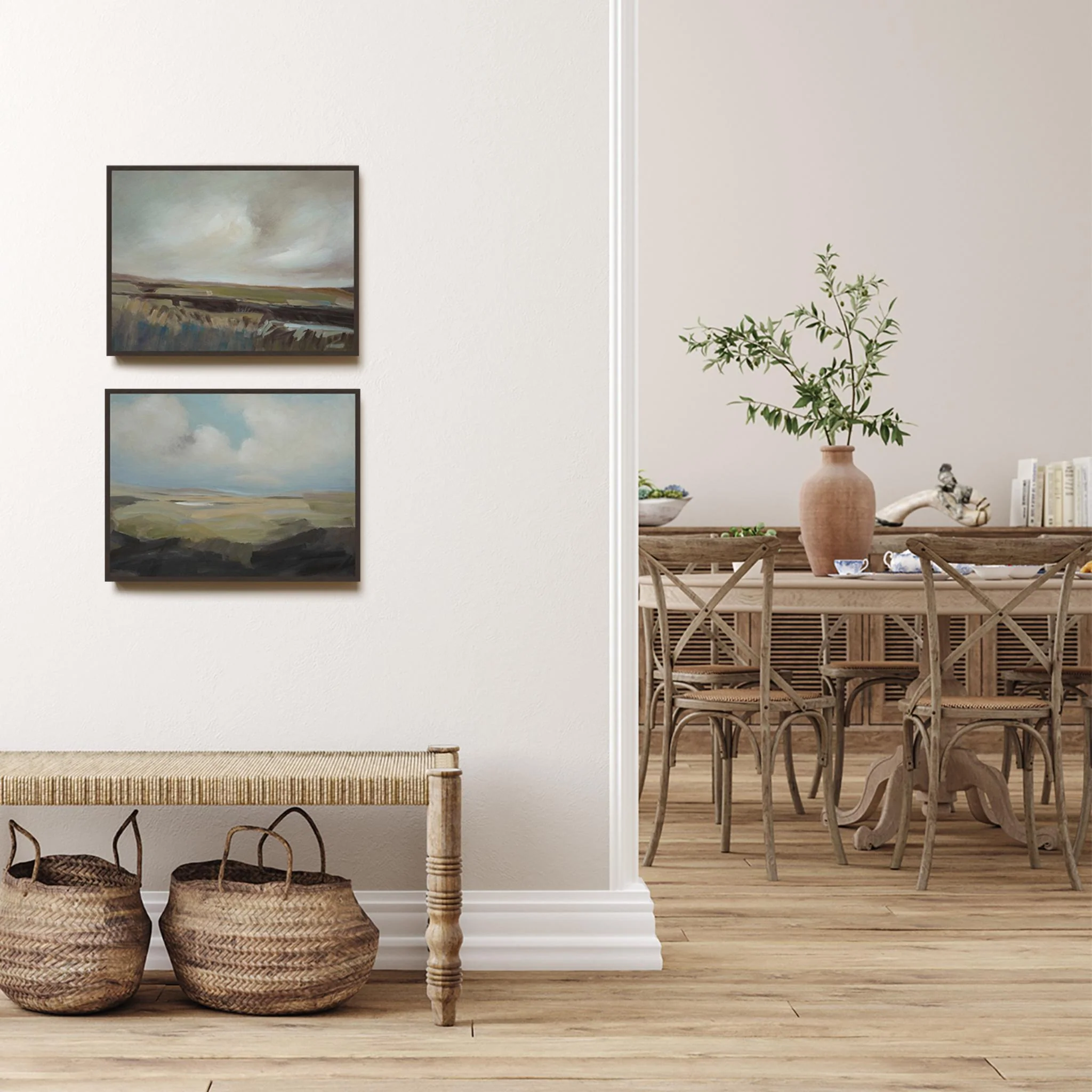 Uplift your space with the calm and balance of Ivan II, a beautifully hand-painted dual-panel artwork that reflects the peaceful essence of open landscapes. Featuring rich earthy browns, gentle sage greens, and soft skies, each panel mirrors the other in tone and movement while offering its own unique perspective.