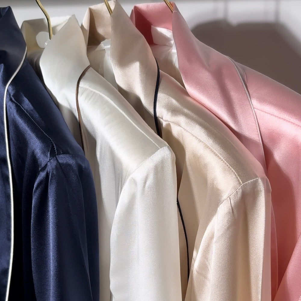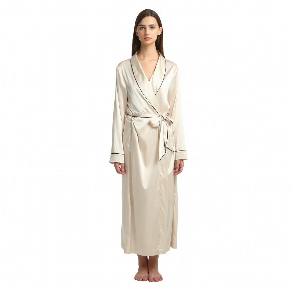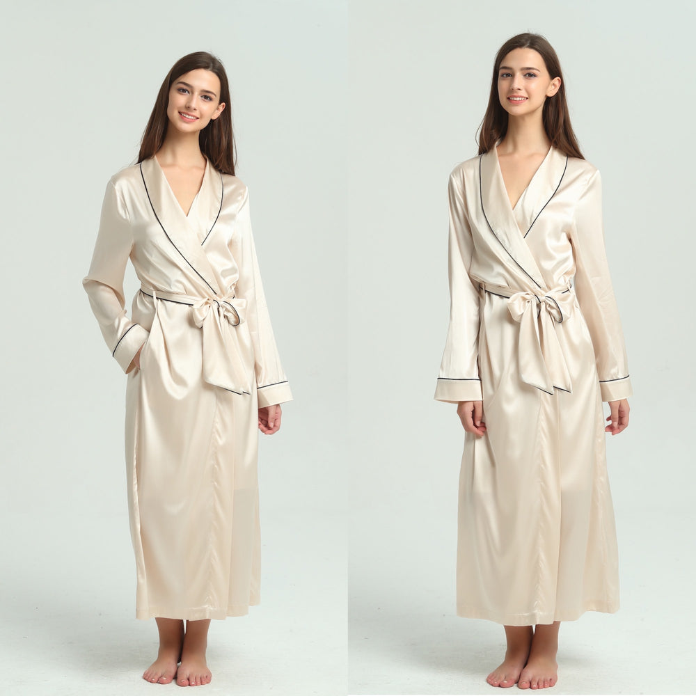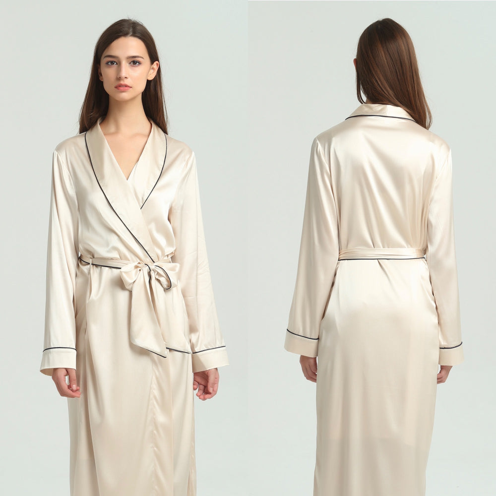 A masterclass in contemporary luxury. This full-length Jasmine Silk dressing gown transports you to a world of glorious glamour. Drape over and pair with our beautifully crafted nude silk nightie to give the ultimate show-stopping appearance. Become a dashing downtime devotee with our 19 momme Pink silk dressing gown
