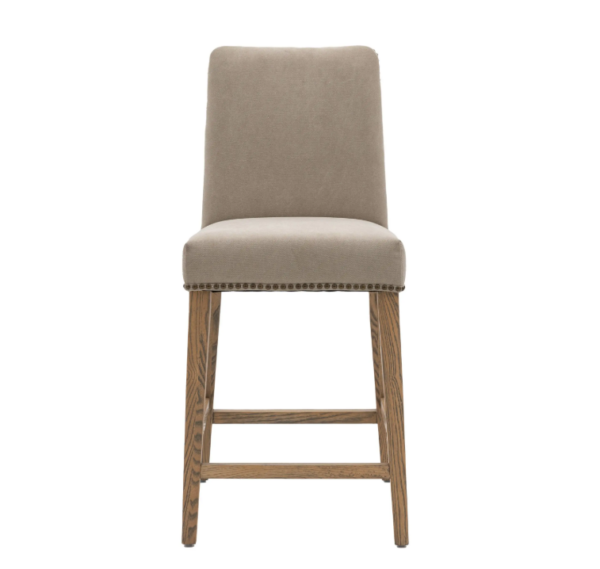 Set of 2 comfortable and chic bar stools. Upholstered in cement grey linen, these bar stools fit seamlessly into a variety of spaces, from modern to traditional. Finished off with brass nail head details and simple angled legs.